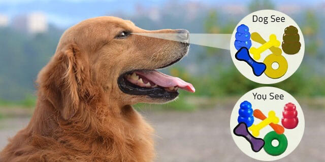 Blue and yellow toys are easiest for dogs to spot against green grass. A red ball may be difficult for a dog to find visually because it blends in with the grass, which they also see as a brownish-yellow.Training Aids: Using blue or yellow markers can help your dog focus more clearly on visual cues during training.Night Vision Advantage: While they see fewer colors, dogs have more "rods" in their retinas, allowing them to see much better than humans in low light and detect movement more easily.