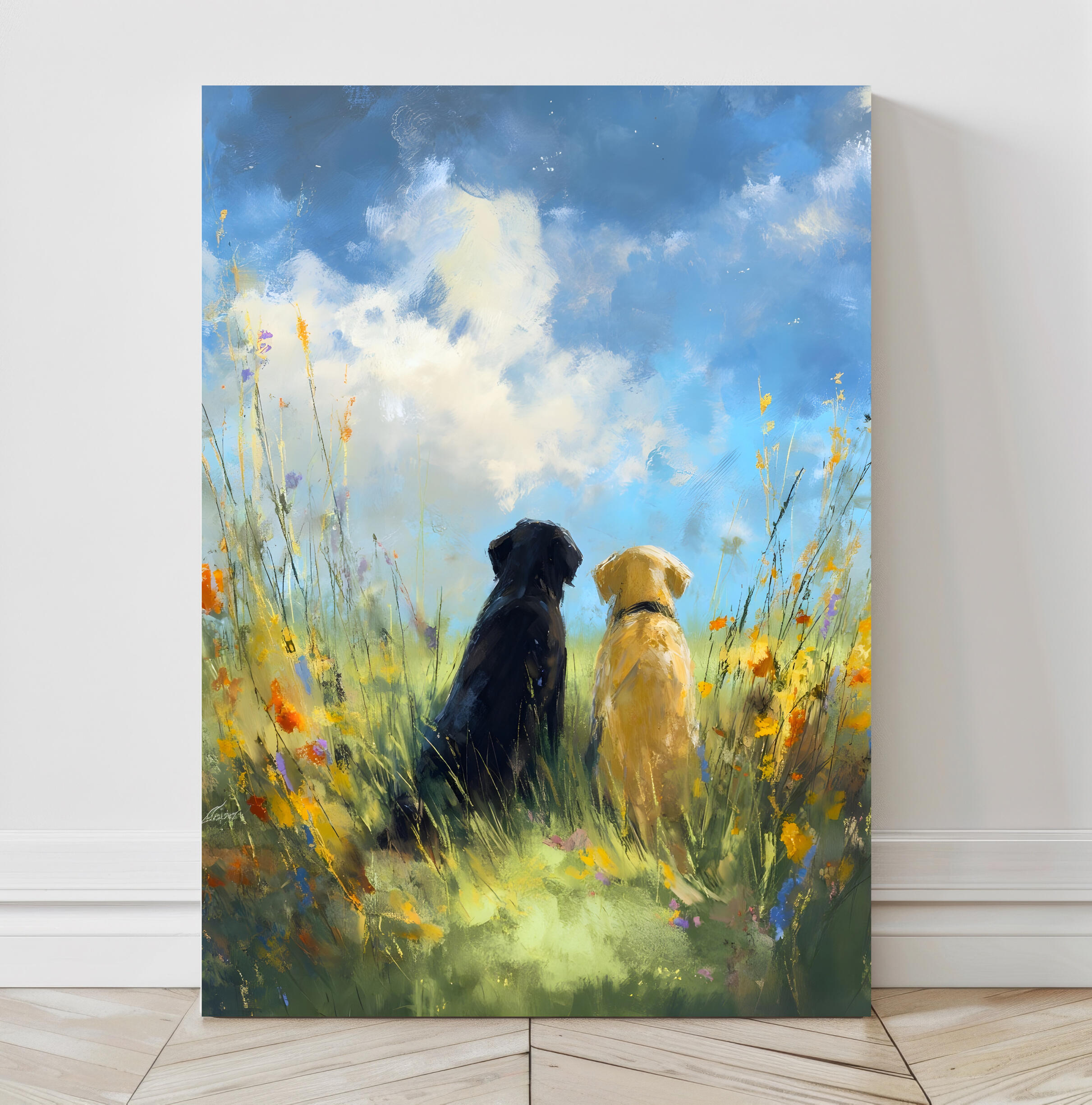 A quiet, sunlit scene captured on matte stretched canvas — two labradors sitting side by side in a wildflower meadow, gazing toward a sky brushed with soft clouds. The textured matte surface mutes glare and enhances painterly brushstrokes, giving the piece a warm, intimate presence on the wall. It fits easily into a living room, hallway, or cozy reading nook and brings a gentle, contemplative mood to everyday spaces. Hang it for a calm reminder of companionship and slow afternoons spent outdoors.